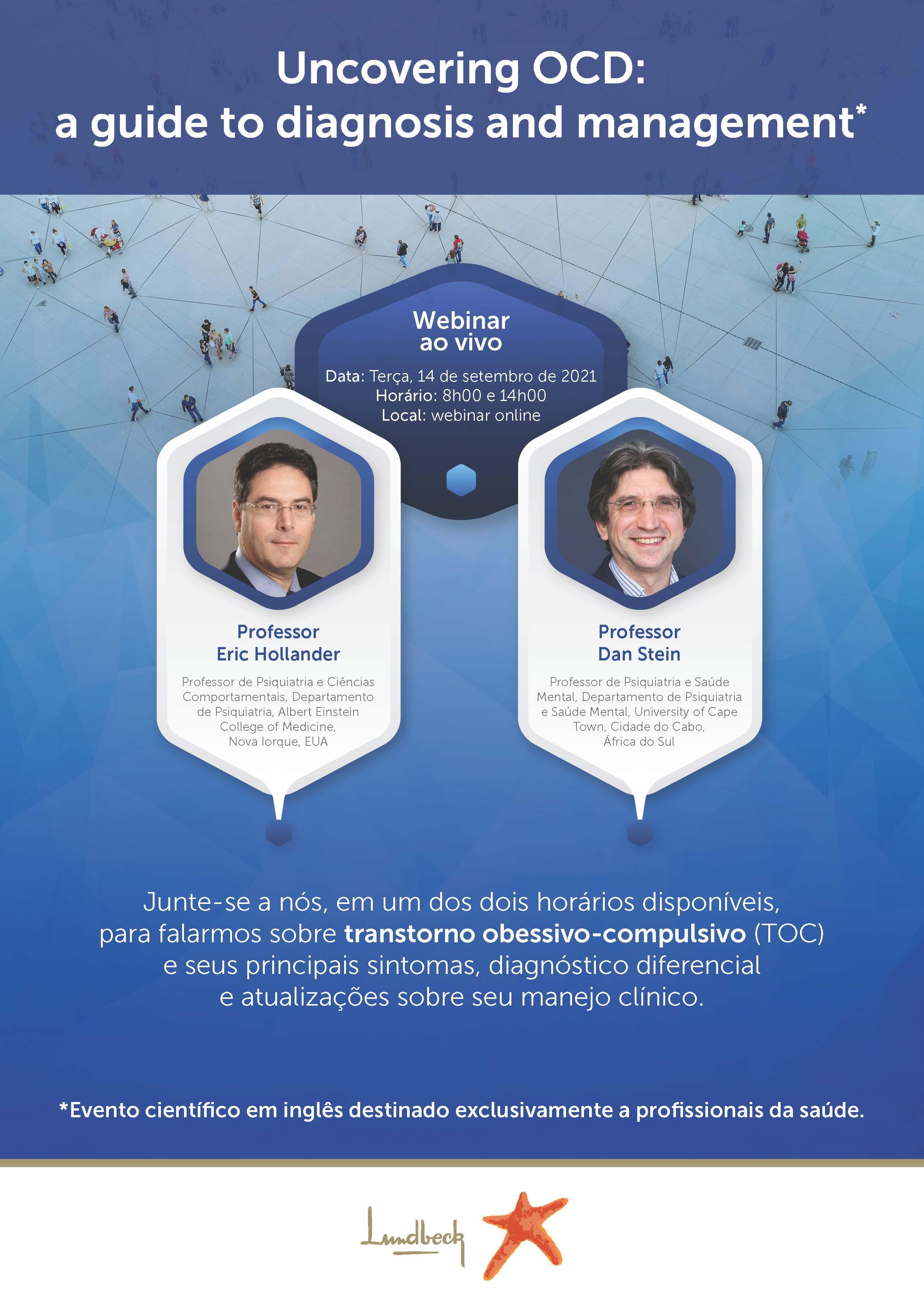 Os palestrantes e especialistas, professores Eric Hollander e Dan Stein, irão destacar o essencial na identificação dos principais sintomas de TOC, considerando outros diagnósticos diferenciais. Também abordarão as principais atualizações no manejo clínico do transtorno.
