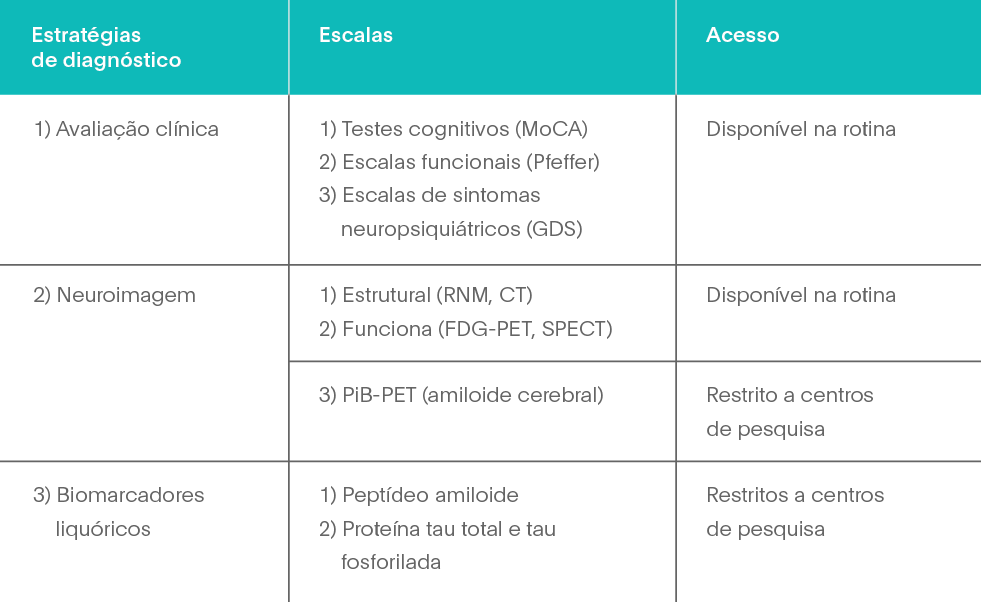 O quadro 2 resume as estratégias de diagnóstico, a denominação de algumas escalas úteis à prática clínica e o acesso atual a esses recursos.Cabe ainda enfatizar que as pessoas com níveis elevados de escolaridade constroem maior nível de “reserva cognitiva”. Na avaliação, é pertinente ao clínico verificar o perfil da intelectualidade do paciente porque o padrão de sua reserva cognitiva pode protegê-lo de um declínio precoce.16 Em outras palavras, o paciente pode apresentar doença de Alzheimer sem que esta seja diagnosticada porque a expressão clínica – cognitiva e funcional – do quadro, ainda preservada, tende a “acobertar” um processo neurodegenerativo em curso.