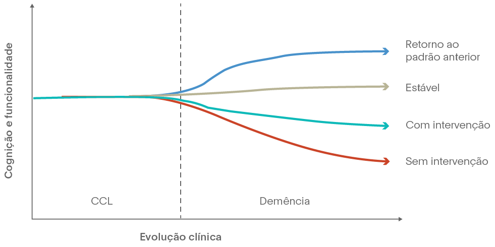 Convém considerar que o cenário que envolve o CCL deve preocupar os médicos que atendem pessoas idosas porque de 5% a 15%, em média, das que apresentam esse quadro evoluem para demência, inclusive DA, condição até o momento inexorável.7 Essa taxa aumenta à medida que a duração da condição se estende ao longo dos anos. Assim, o médico deve estar ciente de que o CCL não representa uma condição que possa ser ignorada. Embora a maioria dos indivíduos com CCL se mantenha ativa em termos cognitivos e funcionais, a possibilidade de progressão para demência, particularmente para doença de Alzheimer, representa um risco considerável.8