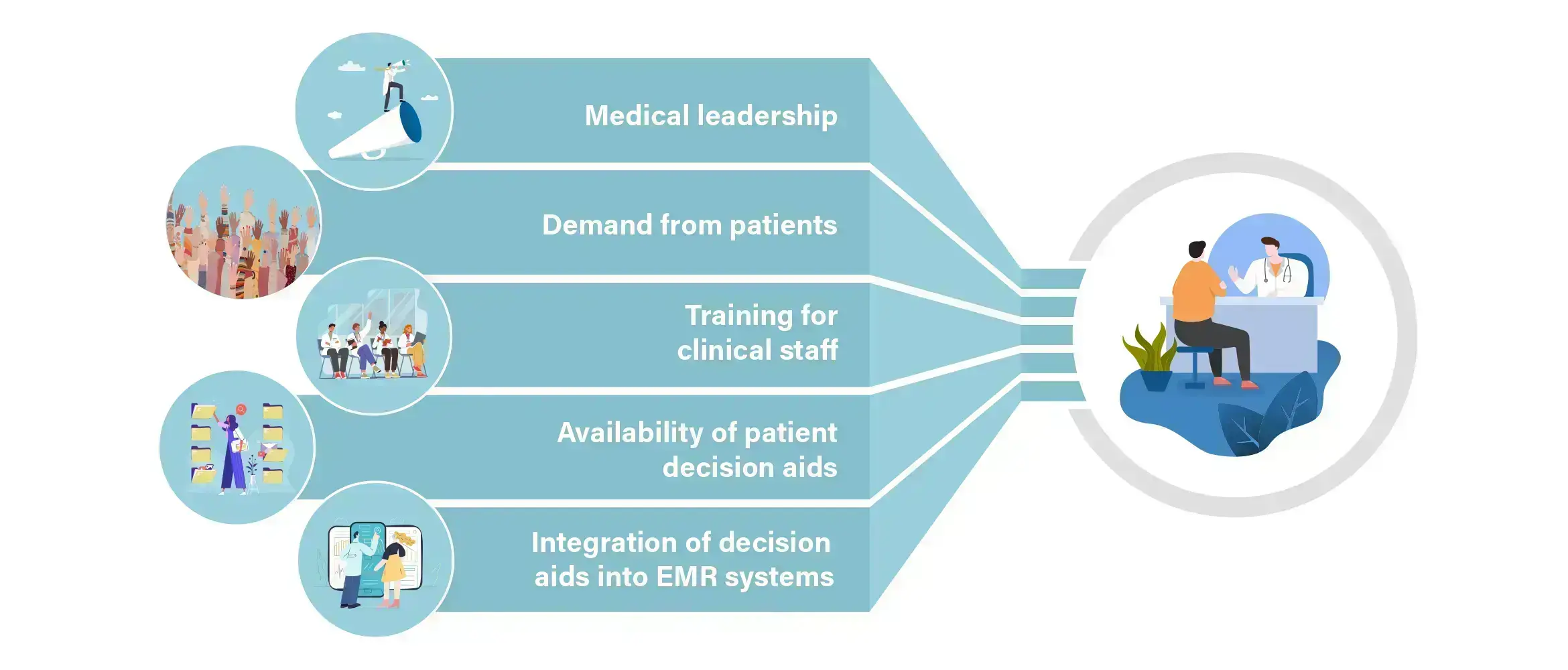 Apesar de seu potencial para facilitar a melhoria do atendimento ao paciente em psicologia e além, a adoção de decisões compartilhadas tem sido lenta. A professora Sampogna citou vários componentes necessários para a adoção, incluindo liderança médica, demanda dos pacientes, treinamento para a equipe clínica, disponibilidade de auxiliares de decisão do paciente e integração de auxiliares de decisão em sistemas de registros médicos eletrônicos.14